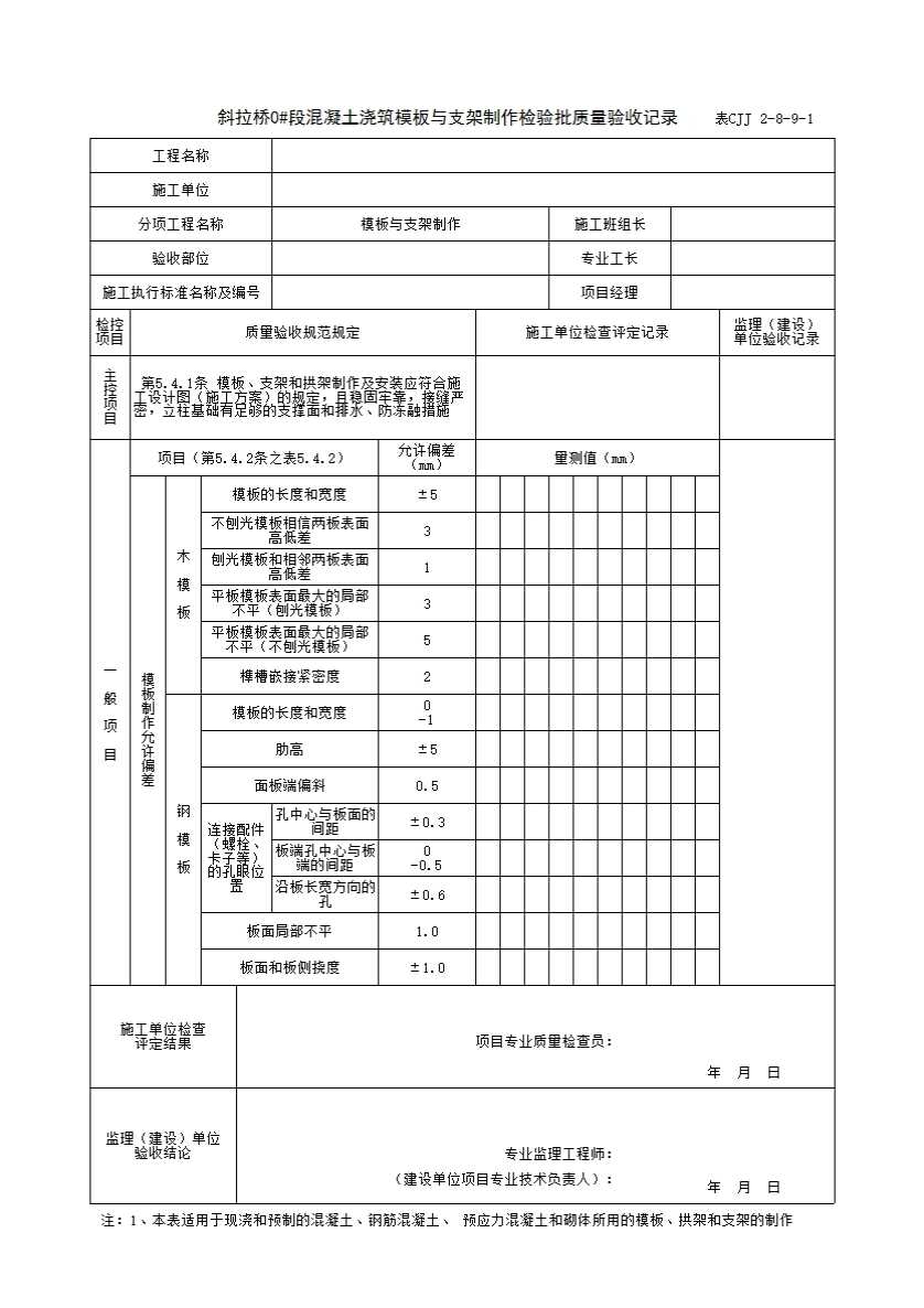 表CJJ 2-8-9-1 斜拉桥0#段混凝土浇筑模板与支架制作检验批质量验收记录