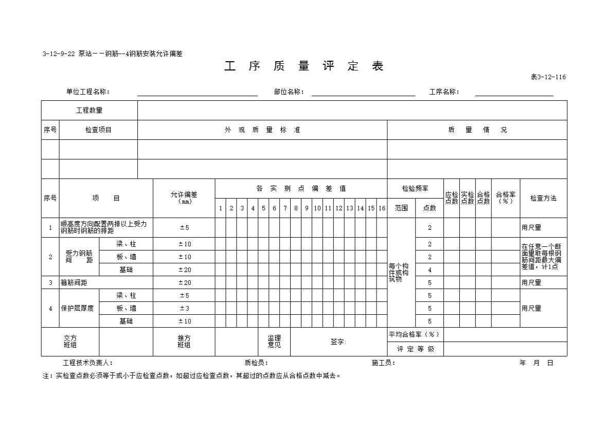 表格名称:工序质量评定表(泵站-钢筋-4钢筋安装允许偏差)