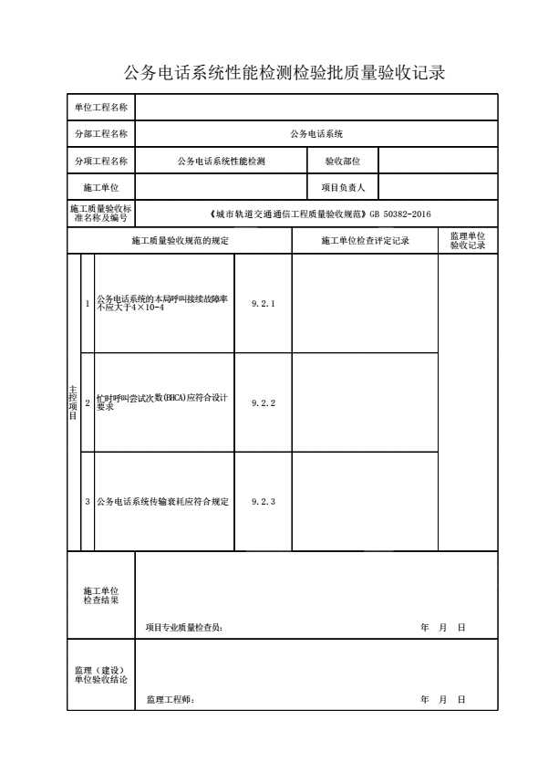 表格名称:公务电话系统性能检测检验批质量验收记录
