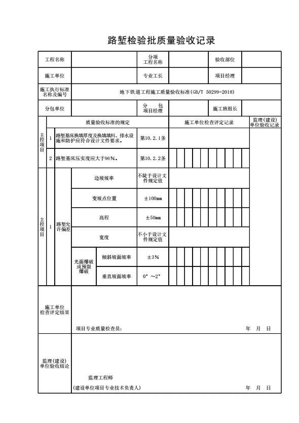 表格名称:路堑检验批质量验收记录