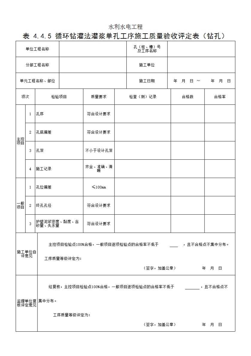 表格名称:表 4.4.5 循环钻灌法灌浆单孔工序施工质量验收评定表(钻孔)