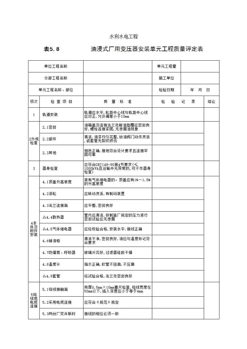 表格名称:表5.8 油浸式厂用变压器安装单元工程质量评定表
