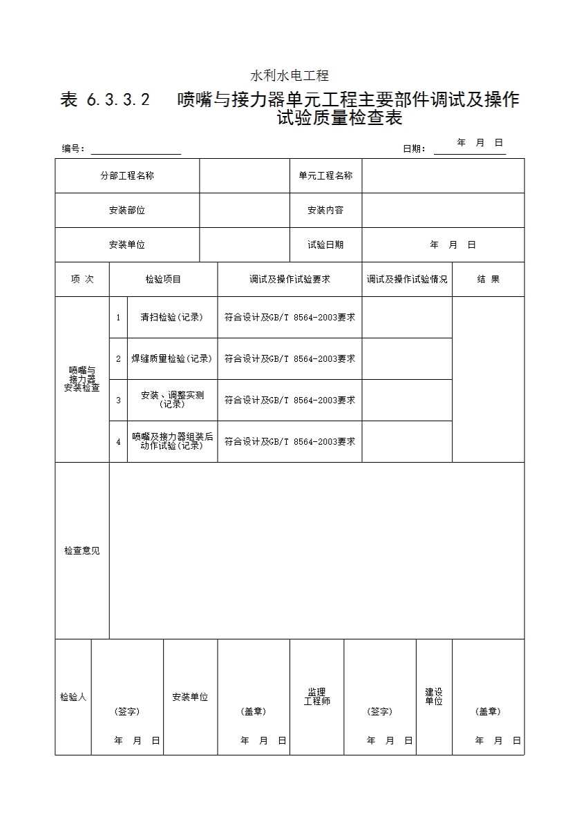 表格名称:表6.3.3.2 喷嘴与接力器单元工程主要部件调试及操作试验质量检查表