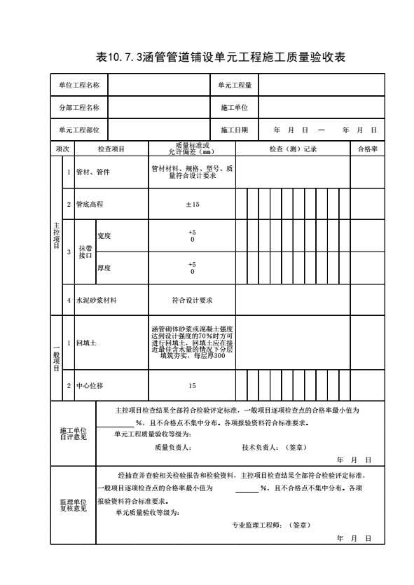 表格名称:表10.7.3 涵管管道铺设单元工程施工质量验收表