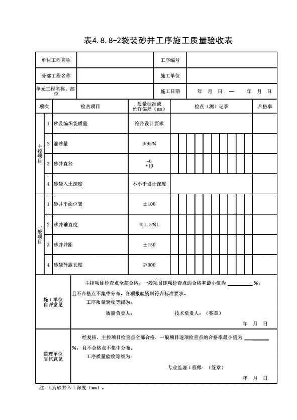 表格名称:表4.8.8-2 袋装砂井工序施工质量验收表