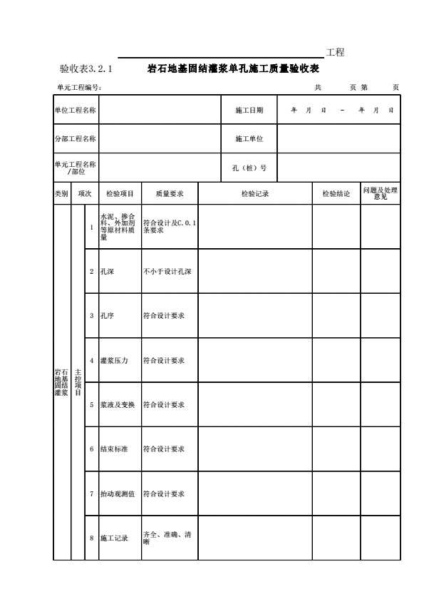 表格名称:表3.2.1 岩石地基固结灌浆单孔施工质量验收表