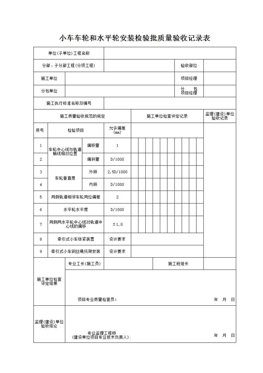 表格名称:小车车轮和水平轮安装检验批质量验收记录表