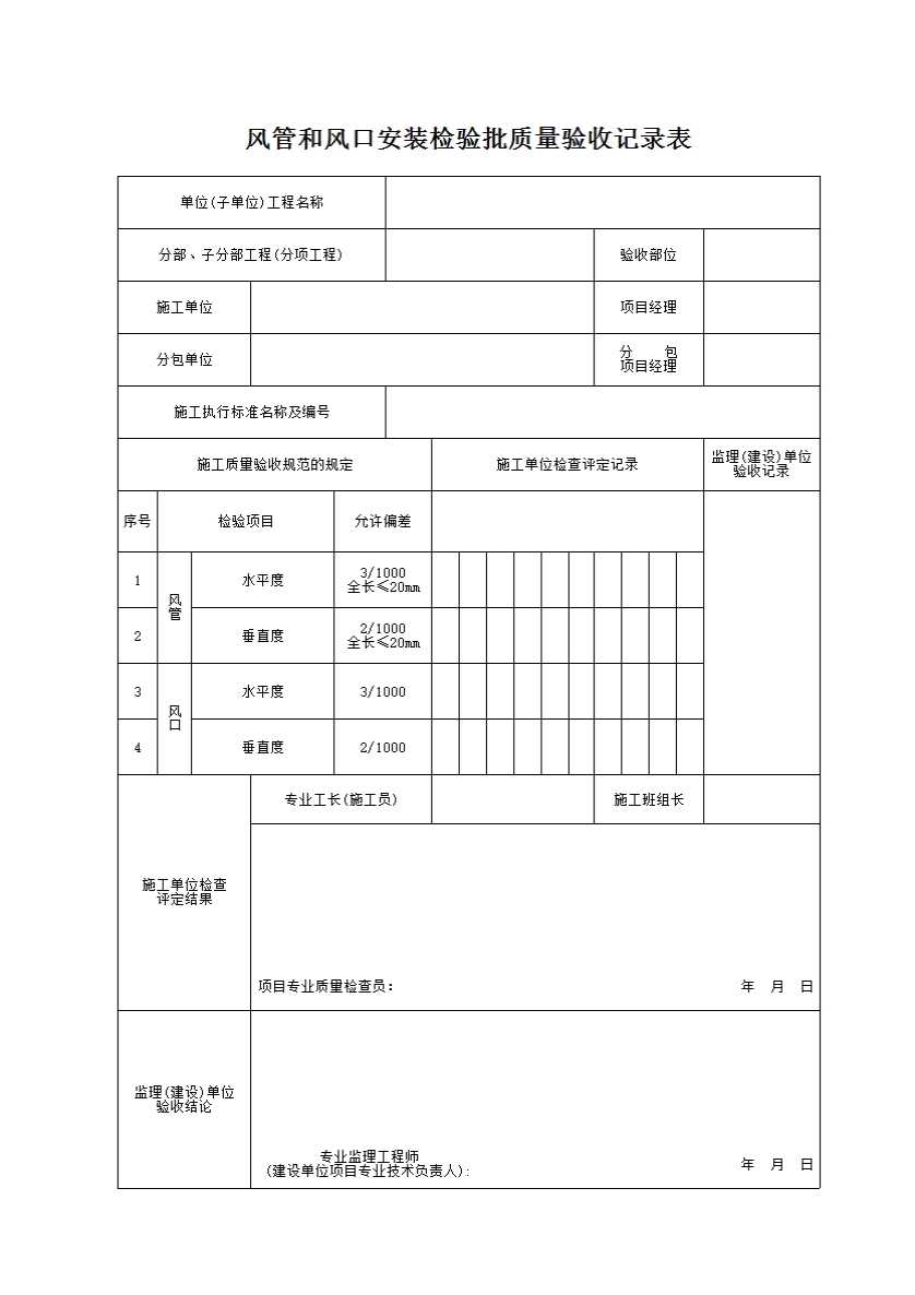 表格名称:风管和风口安装检验批质量验收记录表