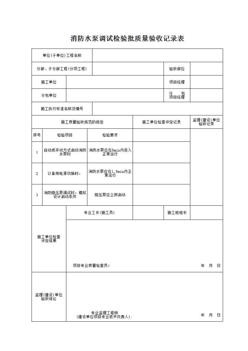 表格名称:消防水泵调试检验批质量验收记录表