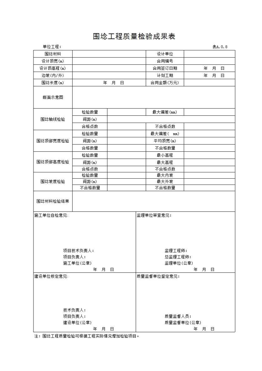 表格名称:表A.0.8 围埝工程质量检验成果表