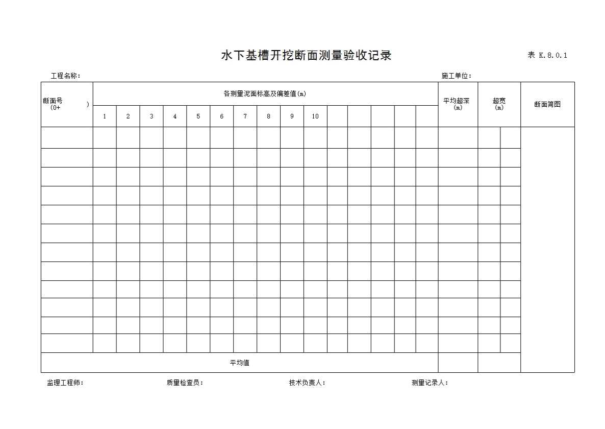 表格名称:表K.8.0.1 水下基槽开挖断面测量验收记录