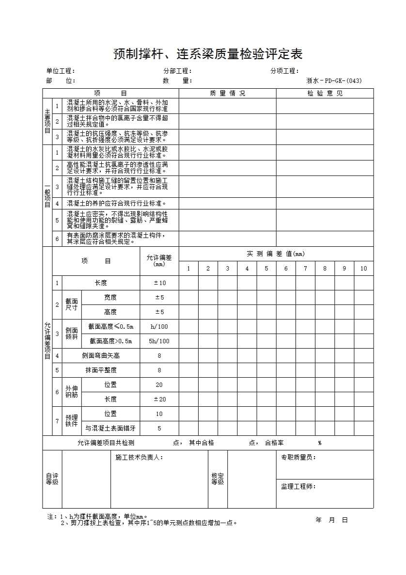 表格名称:043 预制撑杆、连系梁质量检验评定表