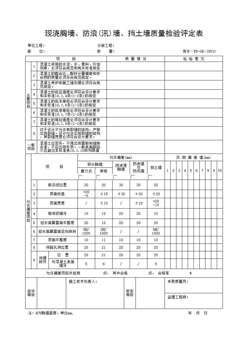 表格名称:053 现浇胸墙、防浪(汛)墙、挡土墙质量检验评定表