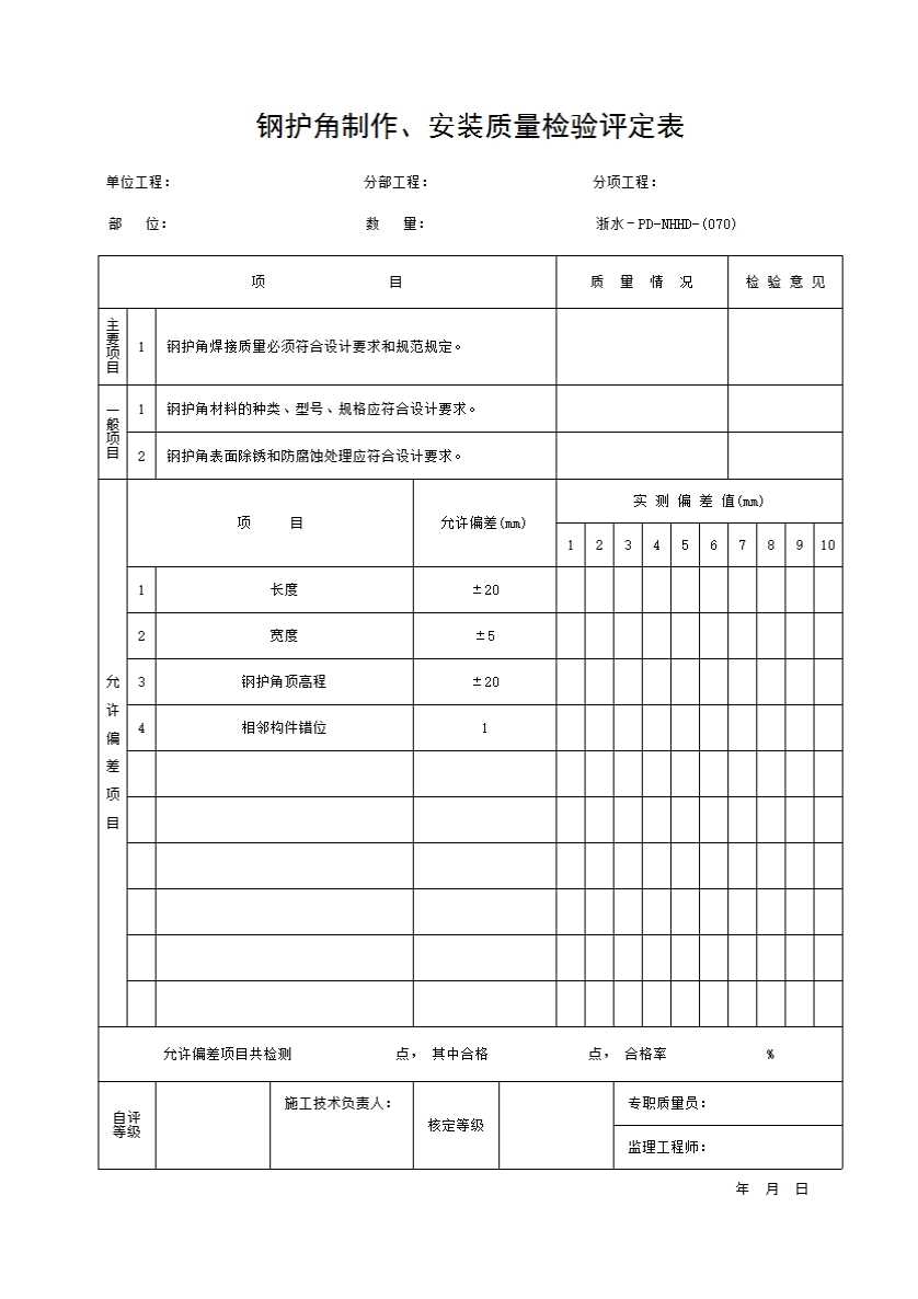表格名称:070 钢护角制作、安装质量检验评定表