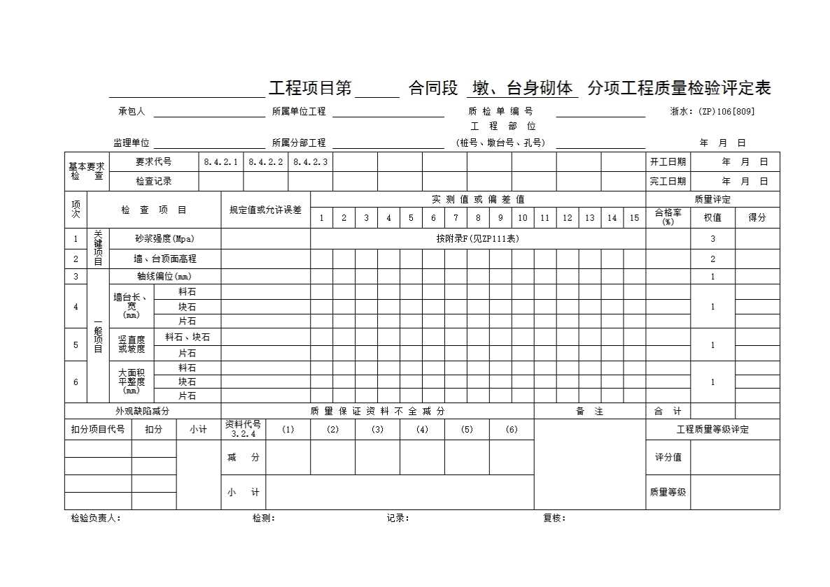 表格名称:009 墩、台身砌体分项工程质量检验评定表