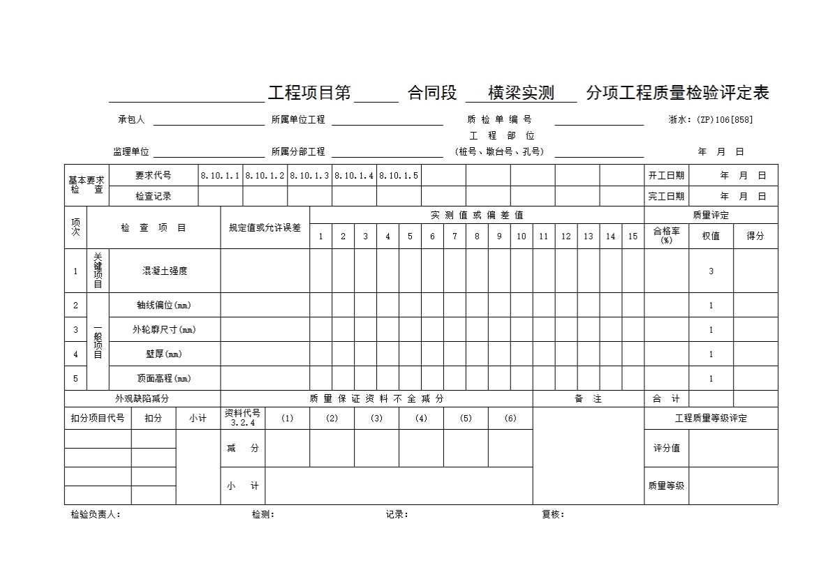 表格名称:058 横梁实测分项工程质量检验评定表