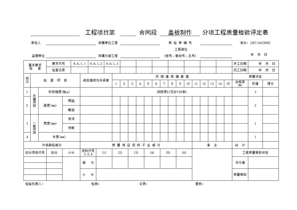 表格名称:111 盖板制作分项工程质量检验评定表