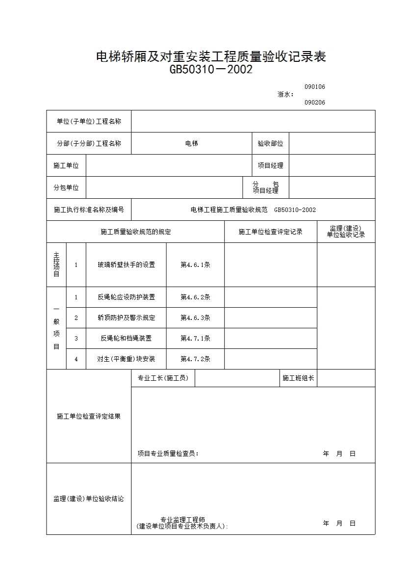 表格名称:232 电梯轿厢及对重安装工程质量验收记录表