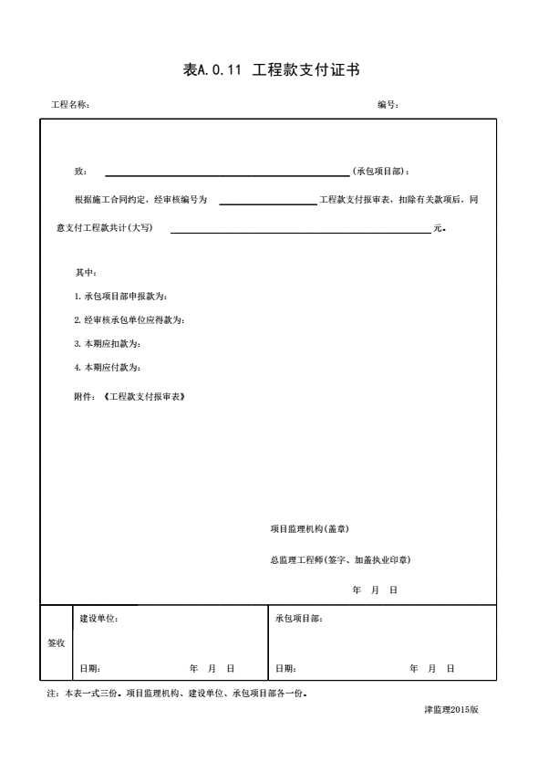 表格名称:表A.0.11 工程款支付证书
