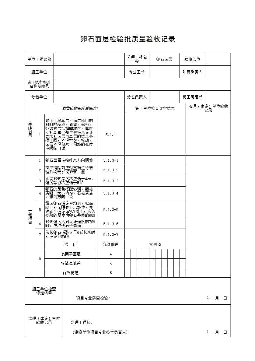 表格名称:卵石面层检验批质量验收记录
