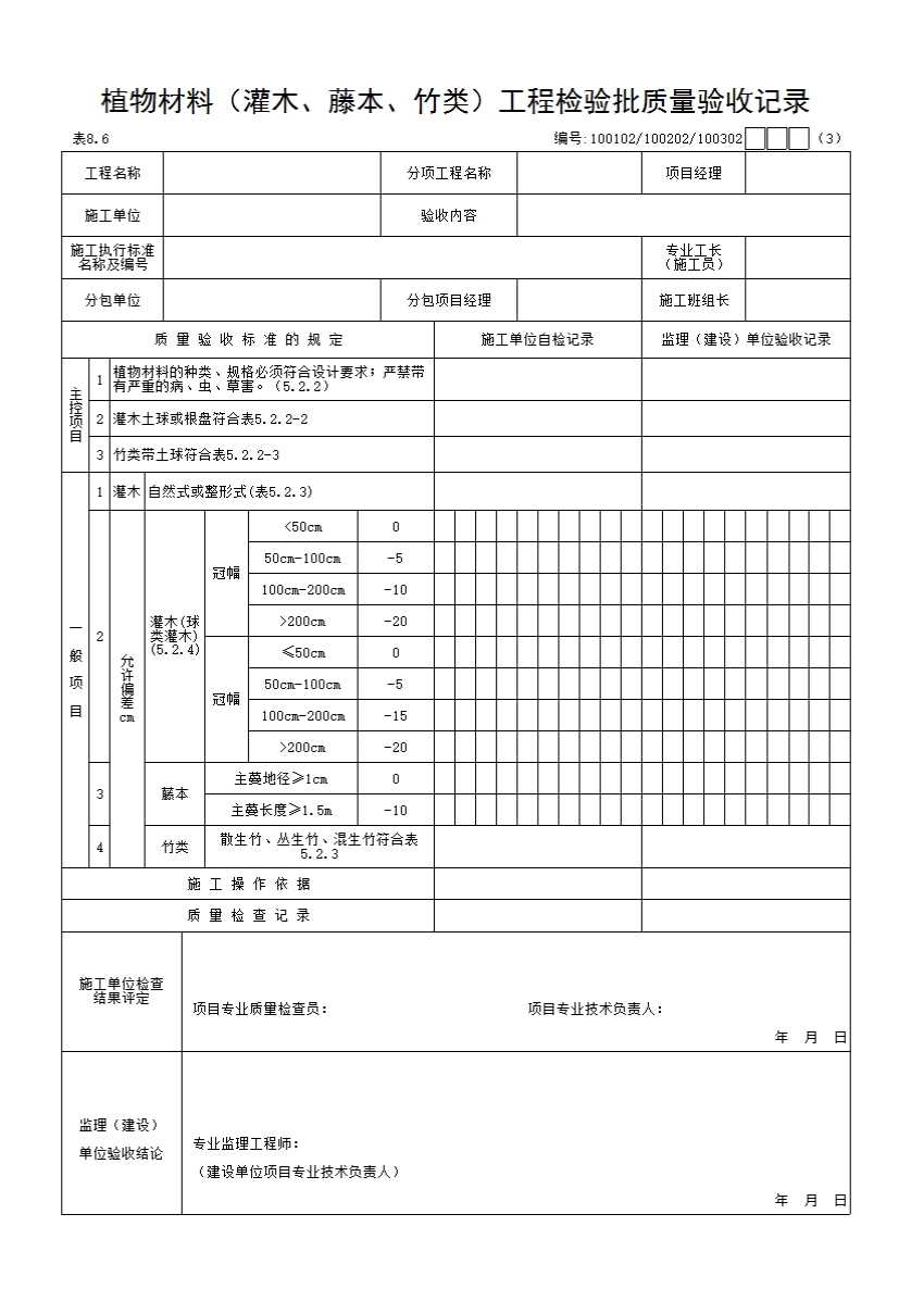 表格名称:100202C_植物材料(灌木、藤本、竹类)工程检验批质量验收记录