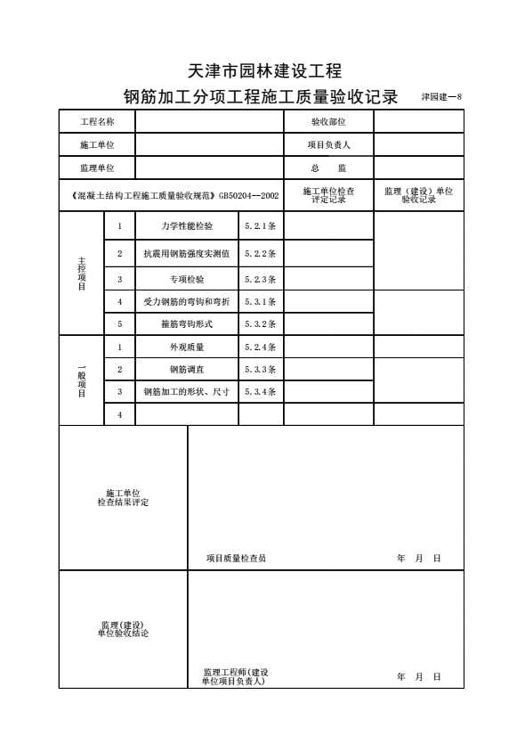 表格名称:天津市园林建设工程钢筋加工分项工程施工质量验收记录