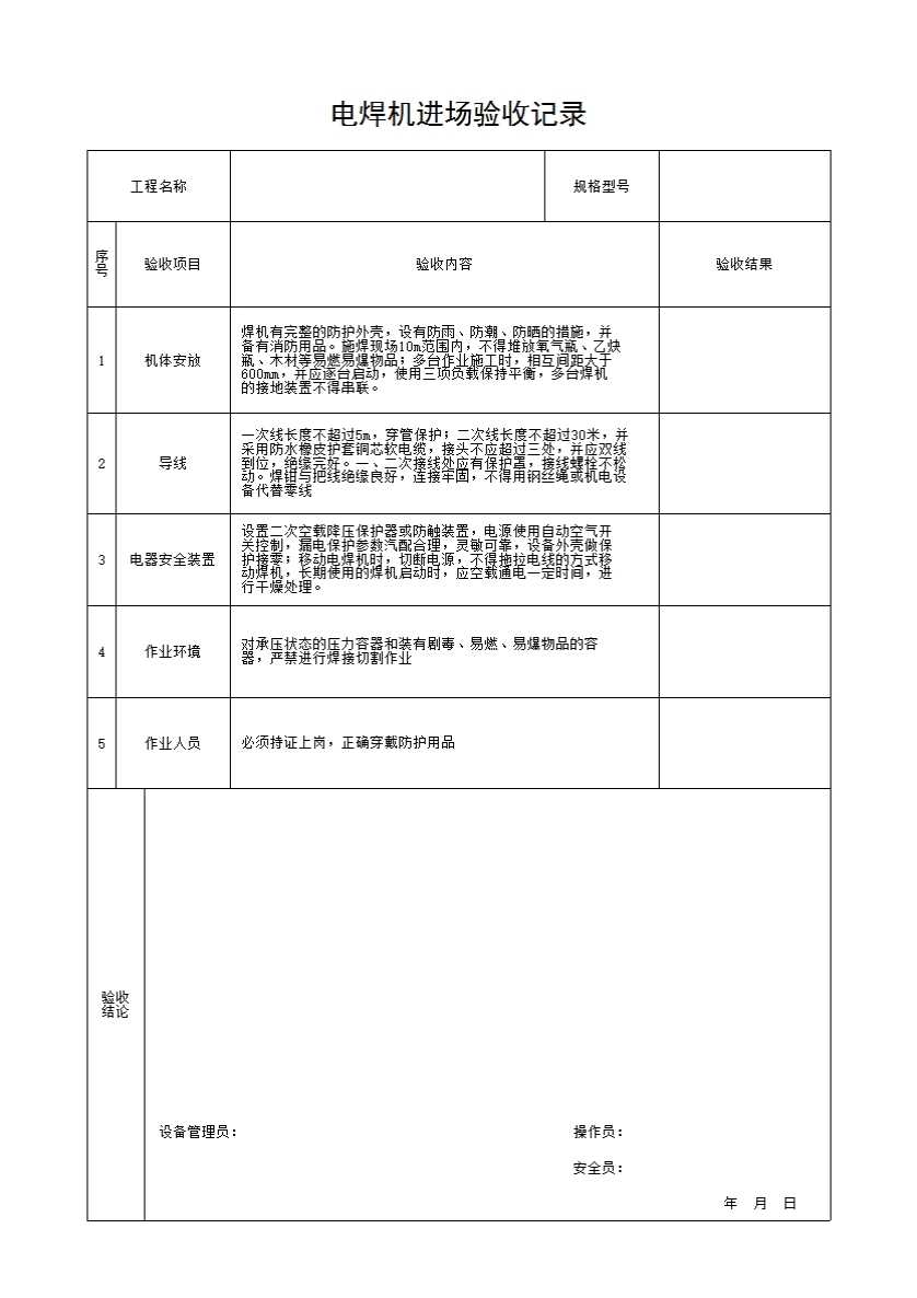 电焊机进场验收记录