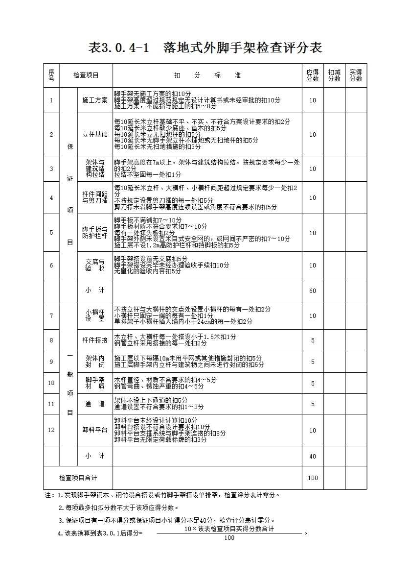 表格名称:表3.0.4-1 落地式外脚手架检查评分表
