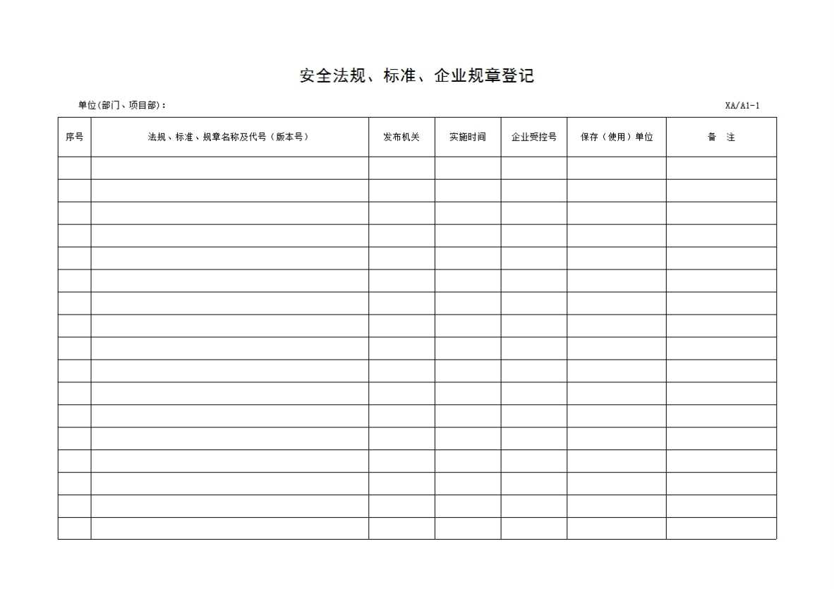 表格名称:XA/A1-1 安全法规、标准、企业规章登记