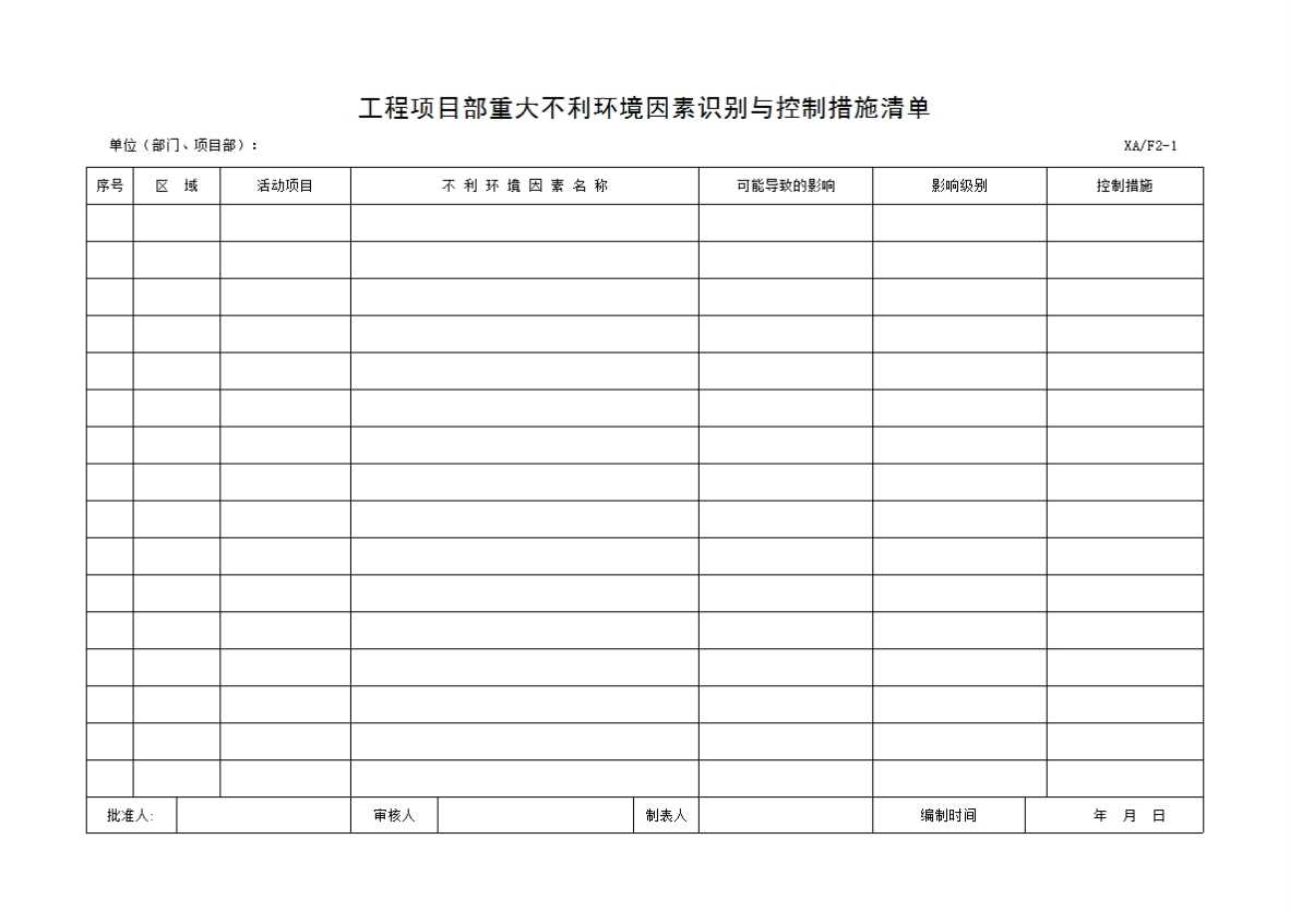 表格名称:XA/F2-1 工程项目部重大不利环境因素识别与控制措施清单