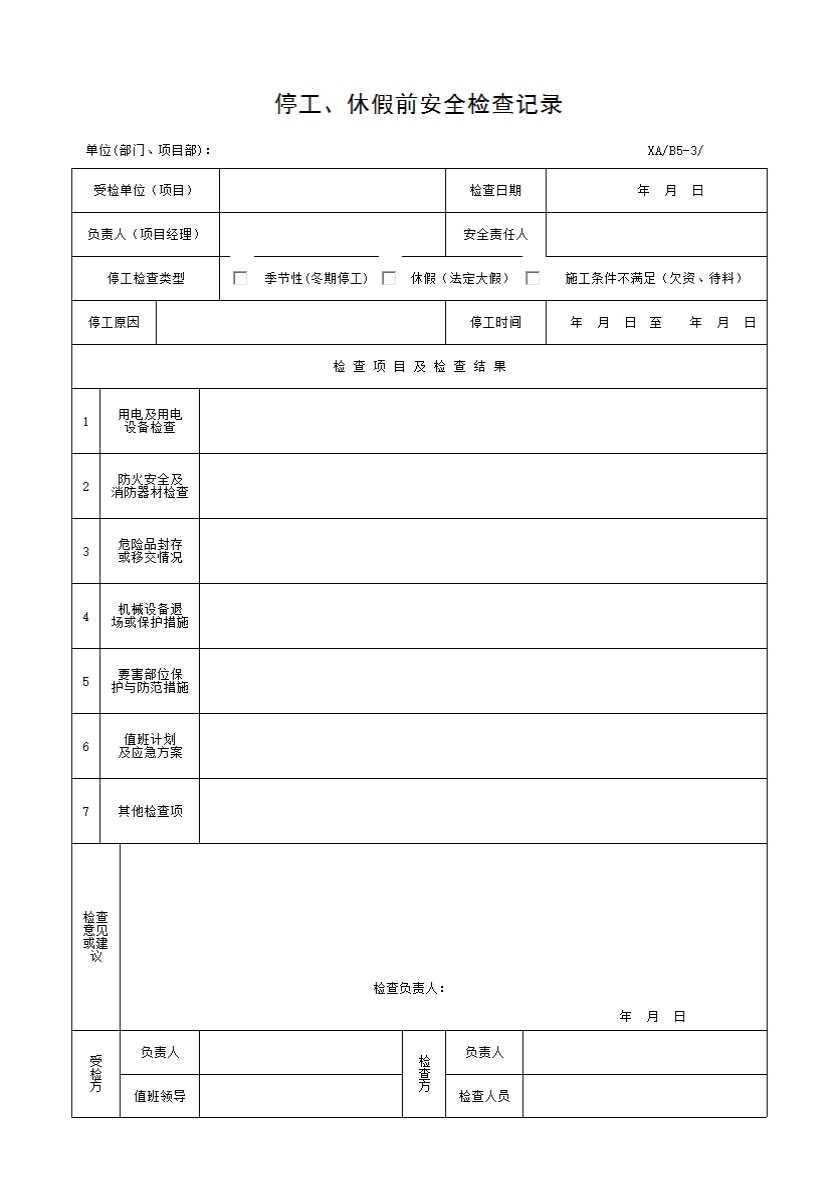 XA/B5-3 停工、休假前安全检查记录