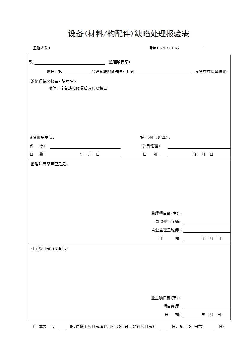表格名称:设备(材料、构配件)缺陷处理报验表