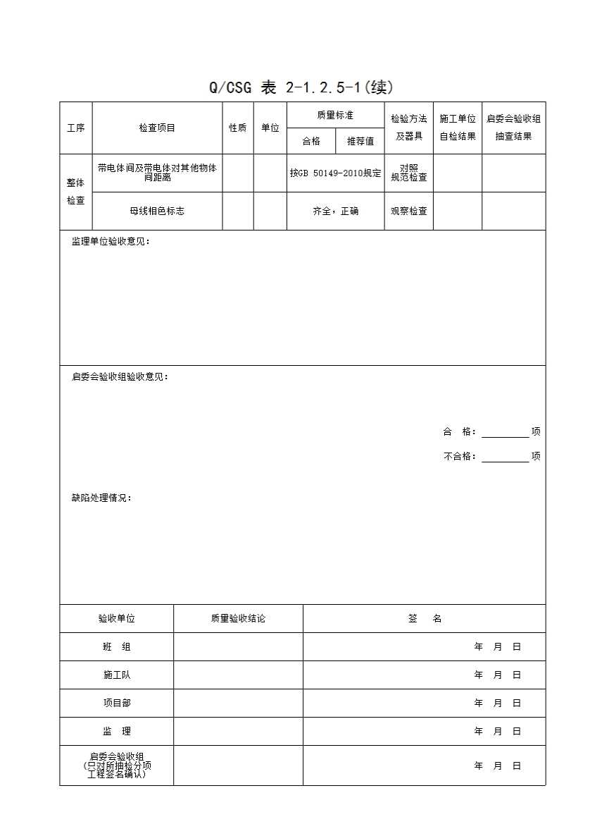 QCSG 表 2-1.2.5-1 中性点管形母线安装 分项工程质量验收记录表