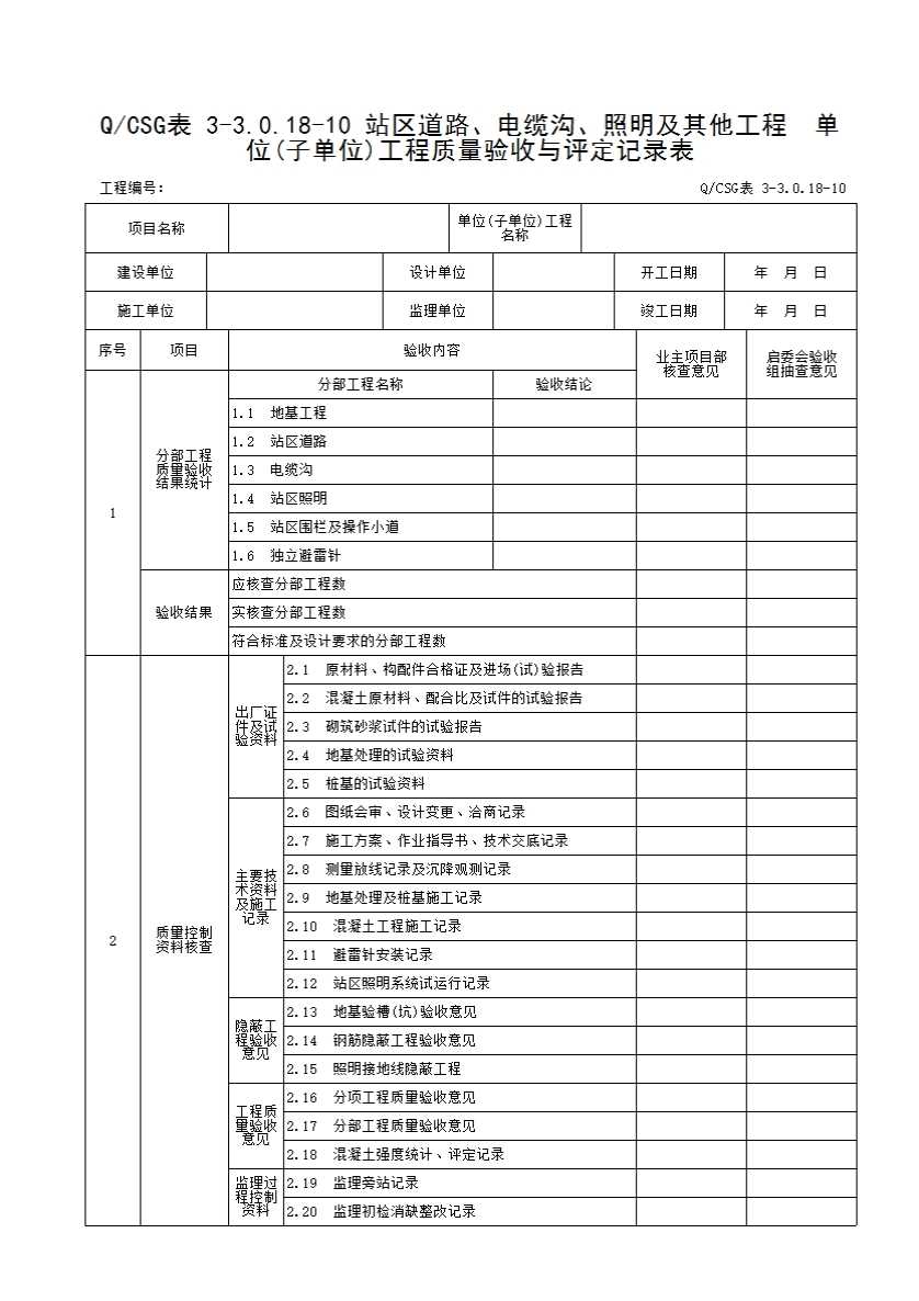 QCSG 表 3-3.0.18-10 站区道路、电缆沟、照明及其他工程 单位(子单位)工程质量验收与评定记录表