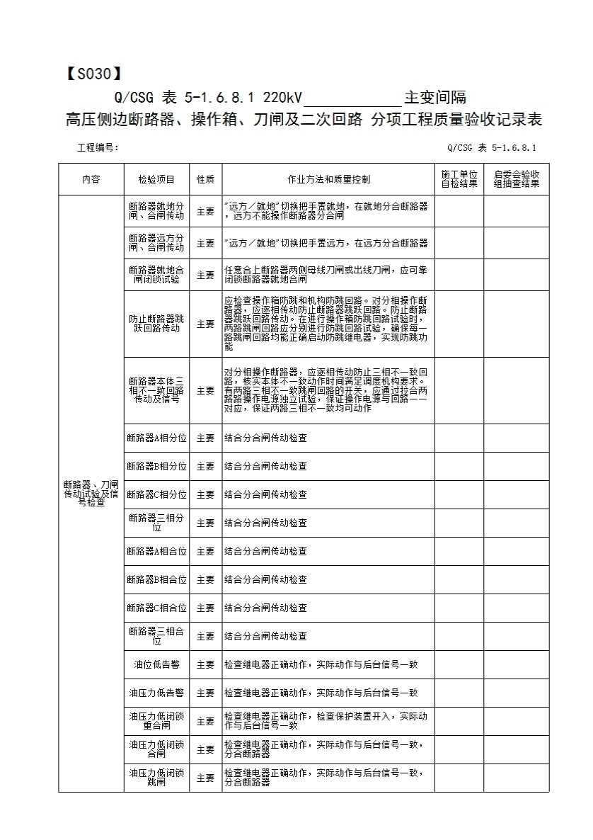 表格名称:QCSG 表 5-1.6.8.1 220kV_____主变间隔 高压侧断路器、操作箱、刀闸及二次回路 分项工程质量验收记录表