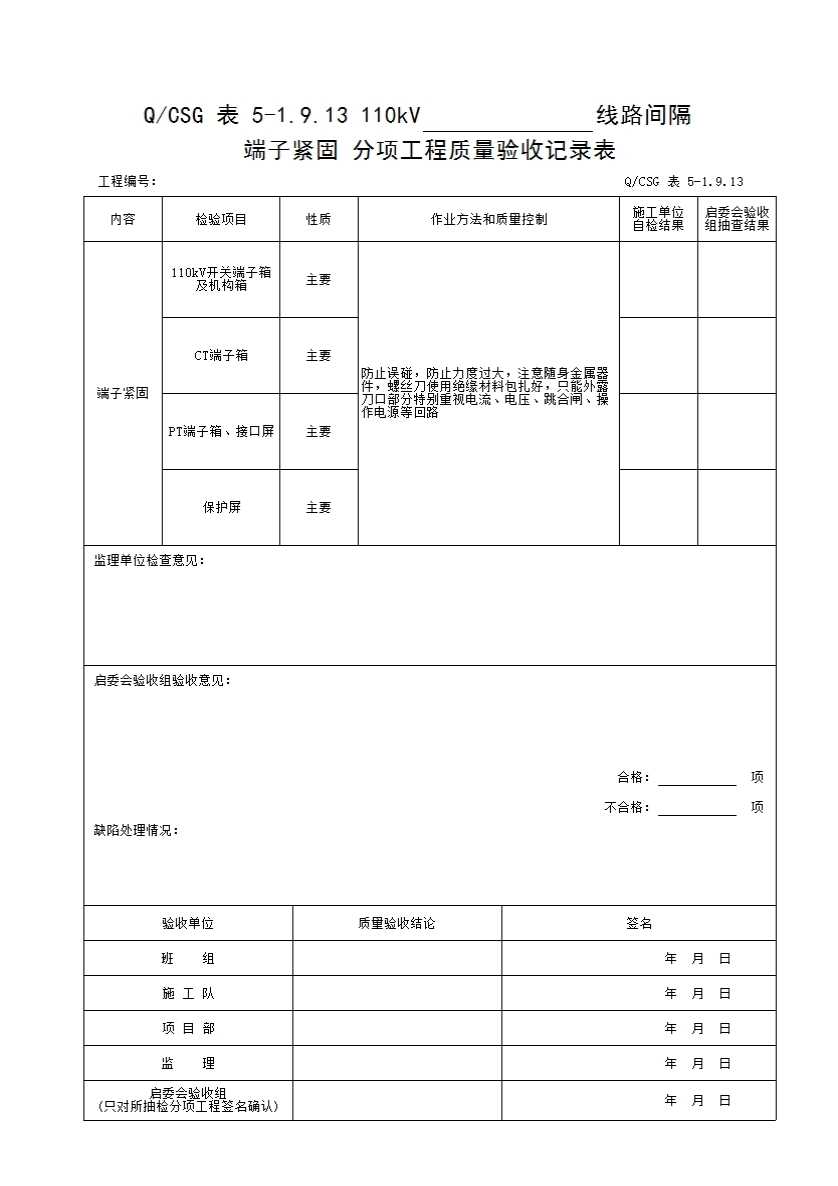 表格名称:QCSG 表 5-1.9.13 110kV______线路间隔端子紧固 分项工程质量验收记录表