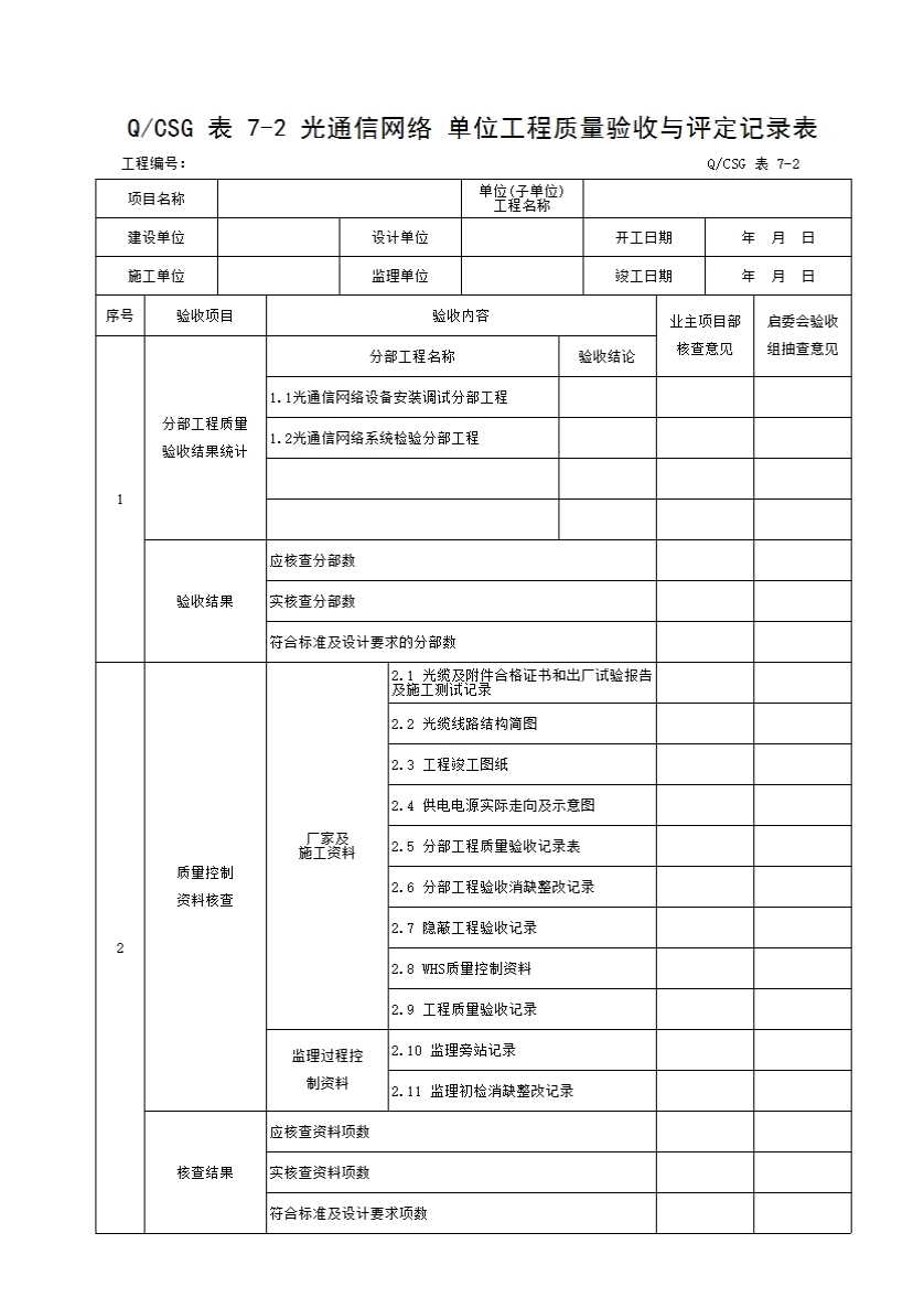 表格名称:2.0 光通信网络 单位工程质量验收与评定记录表