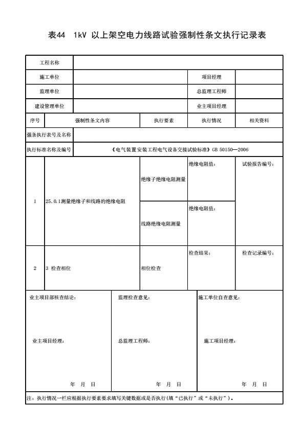 表44 1kV以上架空电力线路试验强制性条文执行记录表