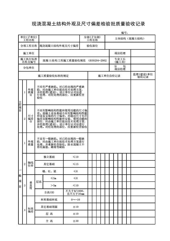 表格名称:现浇混凝土结构外观及尺寸偏差检验批质量验收记录