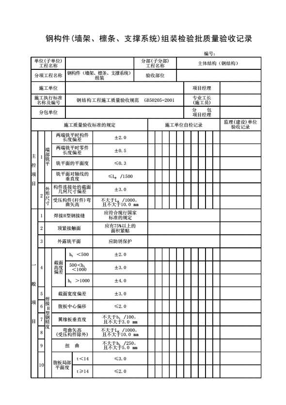 表格名称:钢构件(墙架、檩条、支撑系统)组装检验批质量验收记录
