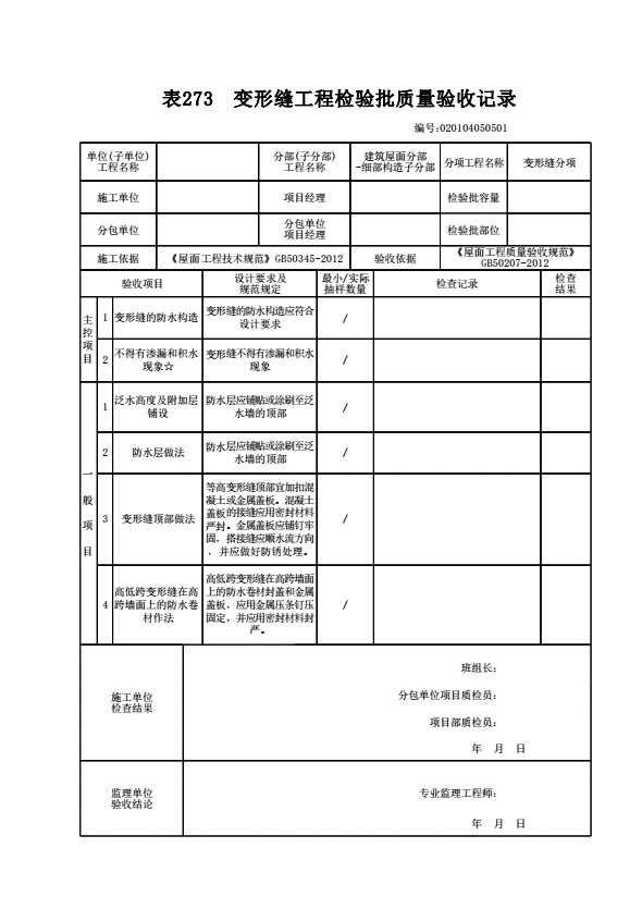 表格名称:020104050501 变形缝工程检验批质量验收记录