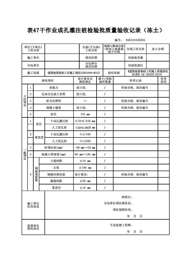 表格名称:050101040204 干作业成孔灌注桩检验批质量验收记录(冻土)