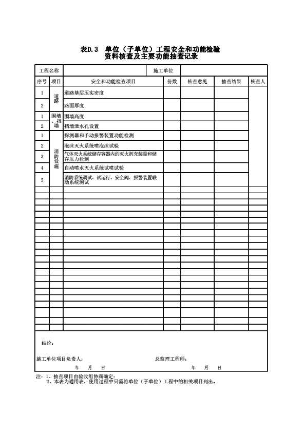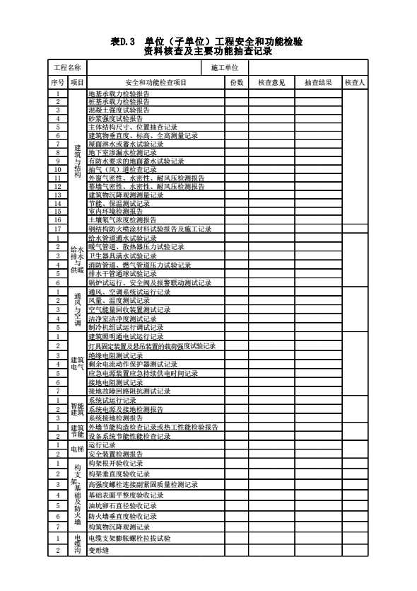 表格名称:表D.3 单位(子单位)工程安全和功能检验