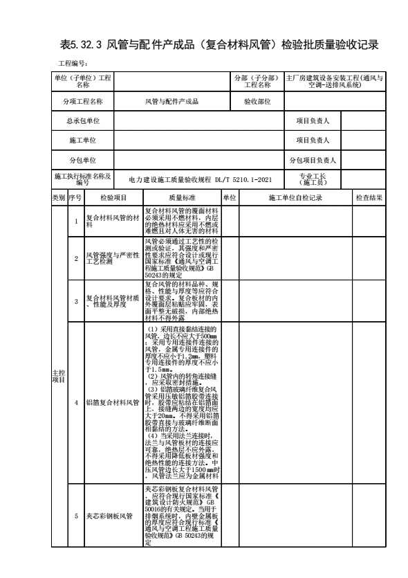 表格名称:表5.32.3 风管与配件产成品(复合材料风管)检验批质量验收记录