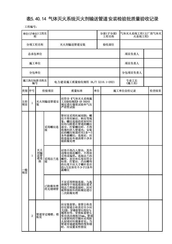表格名称:表5.40.14 气体灭火系统灭火剂输送管道安装检验批质量验收记录