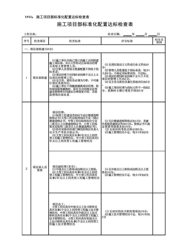 表格名称:YPJ2:施工项目部标准化配置达标检查表
