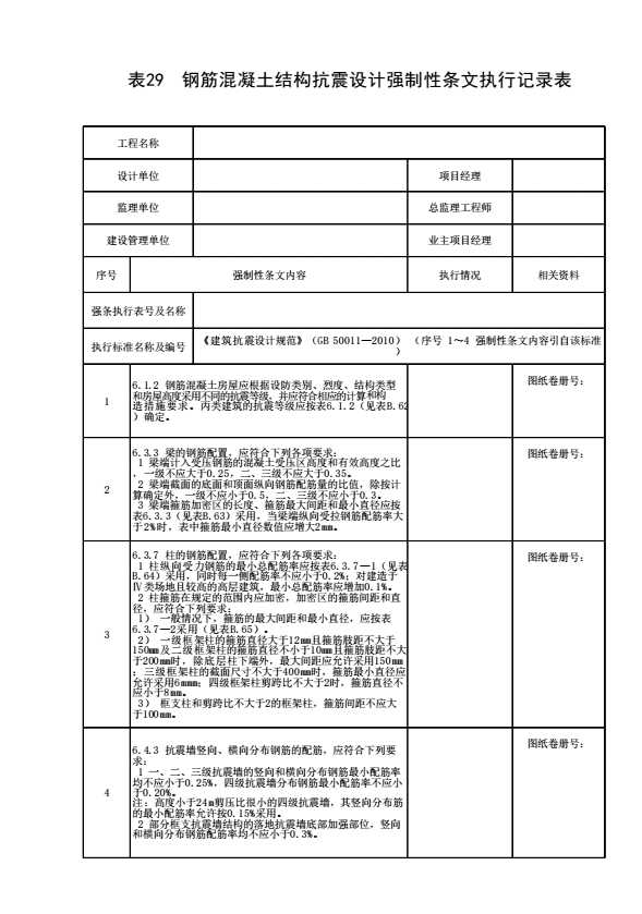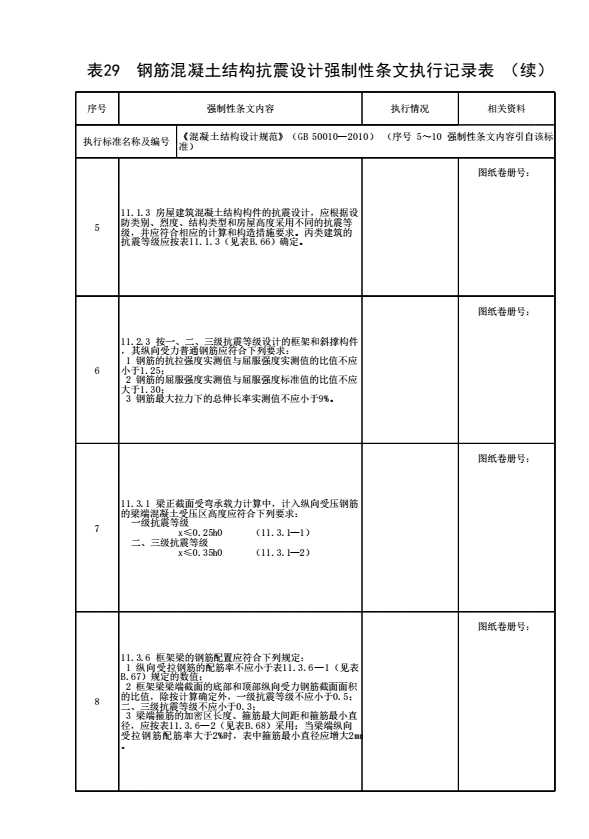 表格名称:表29 钢筋混凝土结构抗震设计强制性条文执行记录表