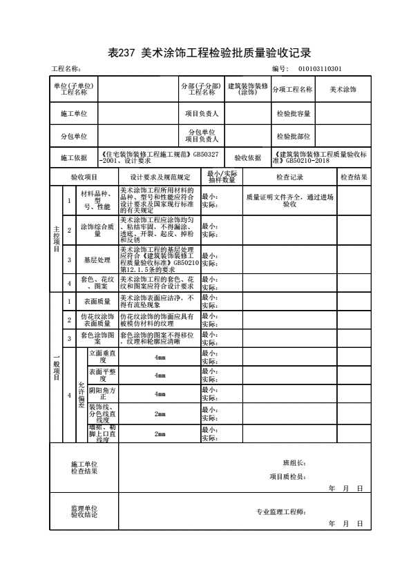 表格名称:010103110301 美术涂饰工程检验批质量验收记录