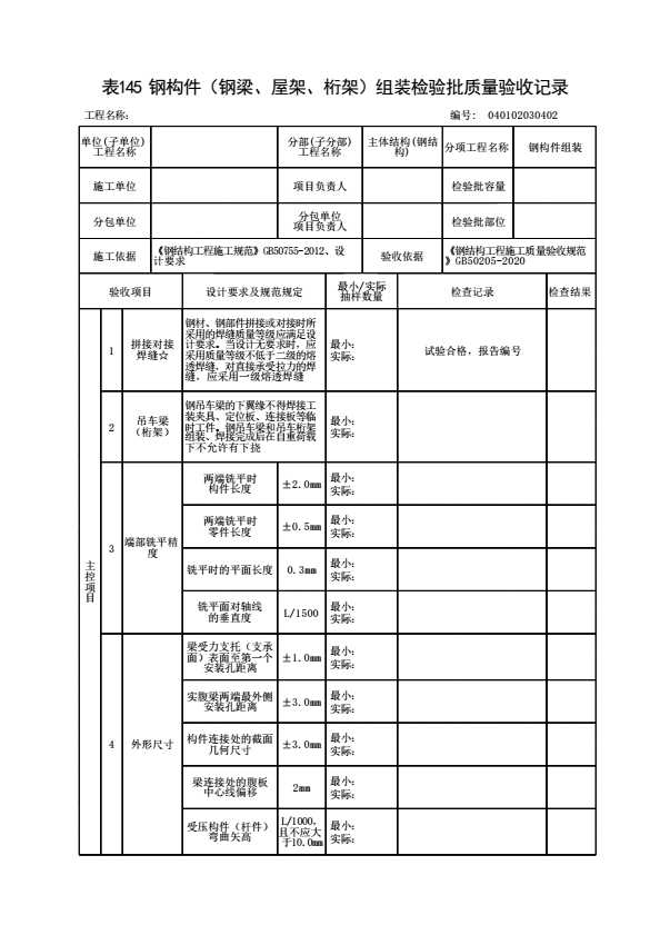 表格名称:040102030402 钢构件(钢梁、屋架、桁架)组装检验批质量验收记录