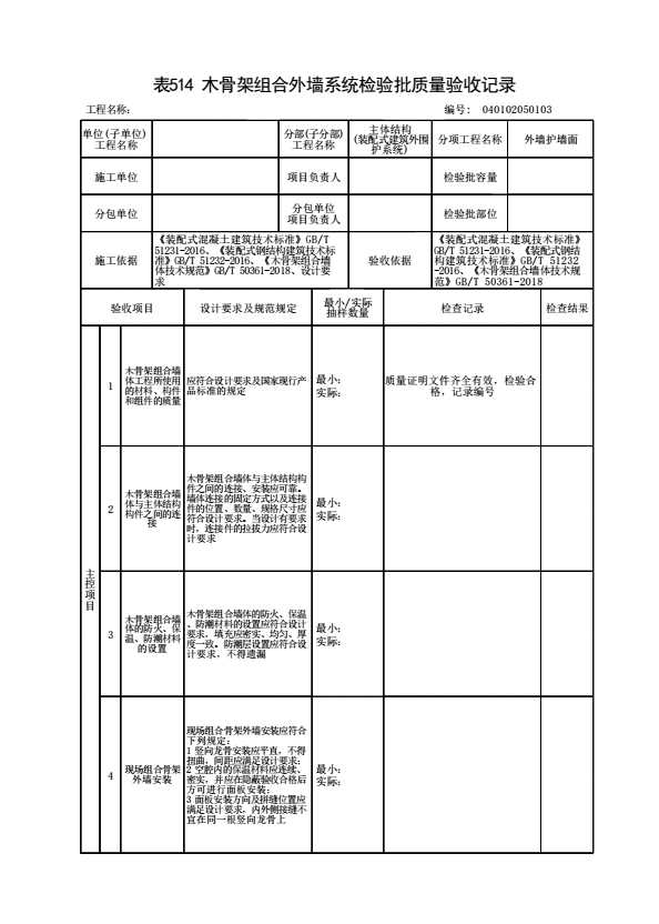 表格名称:040102050103 木骨架组合外墙系统检验批质量验收记录